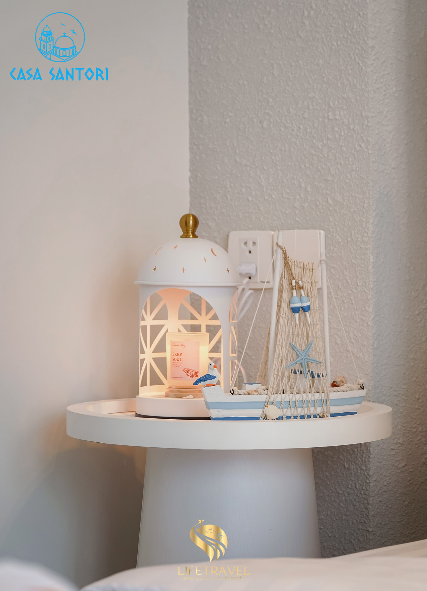 Each bedroom includes thoughtful bedside styling such as decorative boat accents, soft candle lighting, and warm textures that evoke a romantic Mediterranean night.