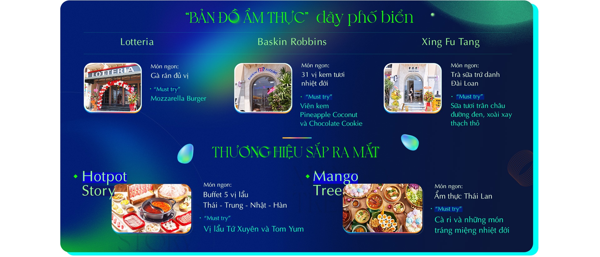 NovaWorld Phan Thiết quy tụ nhiều thương hiệu nhà hàng nổi tiếng như Baskin Robbins, Xing Fu Tang, Lotteria, Hotpot Story, và Saigon Casa Café, đáp ứng đa dạng nhu cầu ẩm thực của du khách. Tại đây, bạn có thể thưởng thức từ kem, trà sữa đến các món ăn nhanh và cà phê đặc biệt.