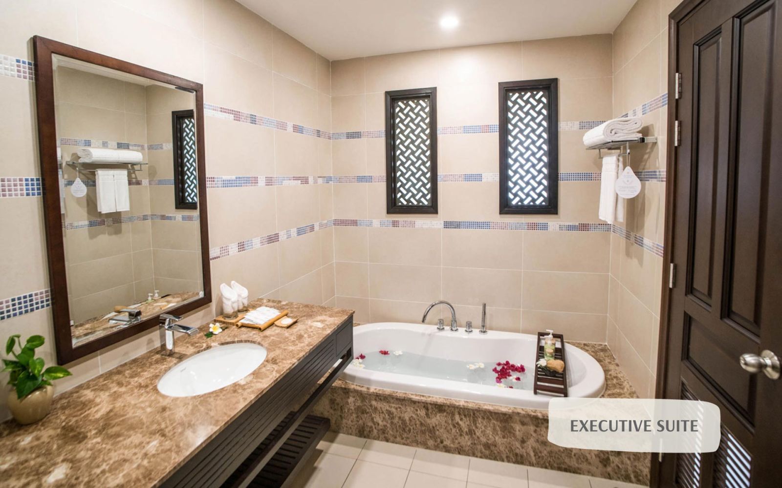 • Phòng tắm: Thiết kế bán lộ thiên với bồn tắm đá cuội tạo trải nghiệm nghỉ dưỡng khác biệt.