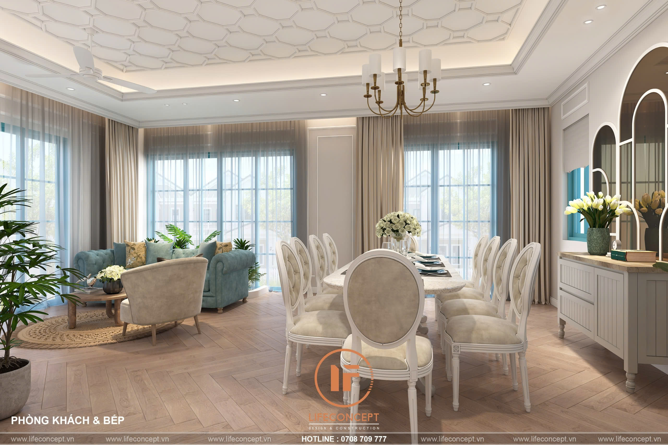 • Màu Sắc Trang Nhã: Màu sắc chủ đạo thường là các gam màu trung tính như trắng, kem, vàng nhạt. Sử dụng màu sắc xanh làm điểm nhấn. Tạo nên sự tươi mới và trẻ trung, đồng thời vẫn giữ được vẻ đẹp cổ điển và trang nhã.