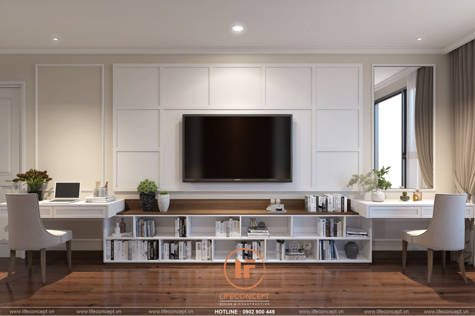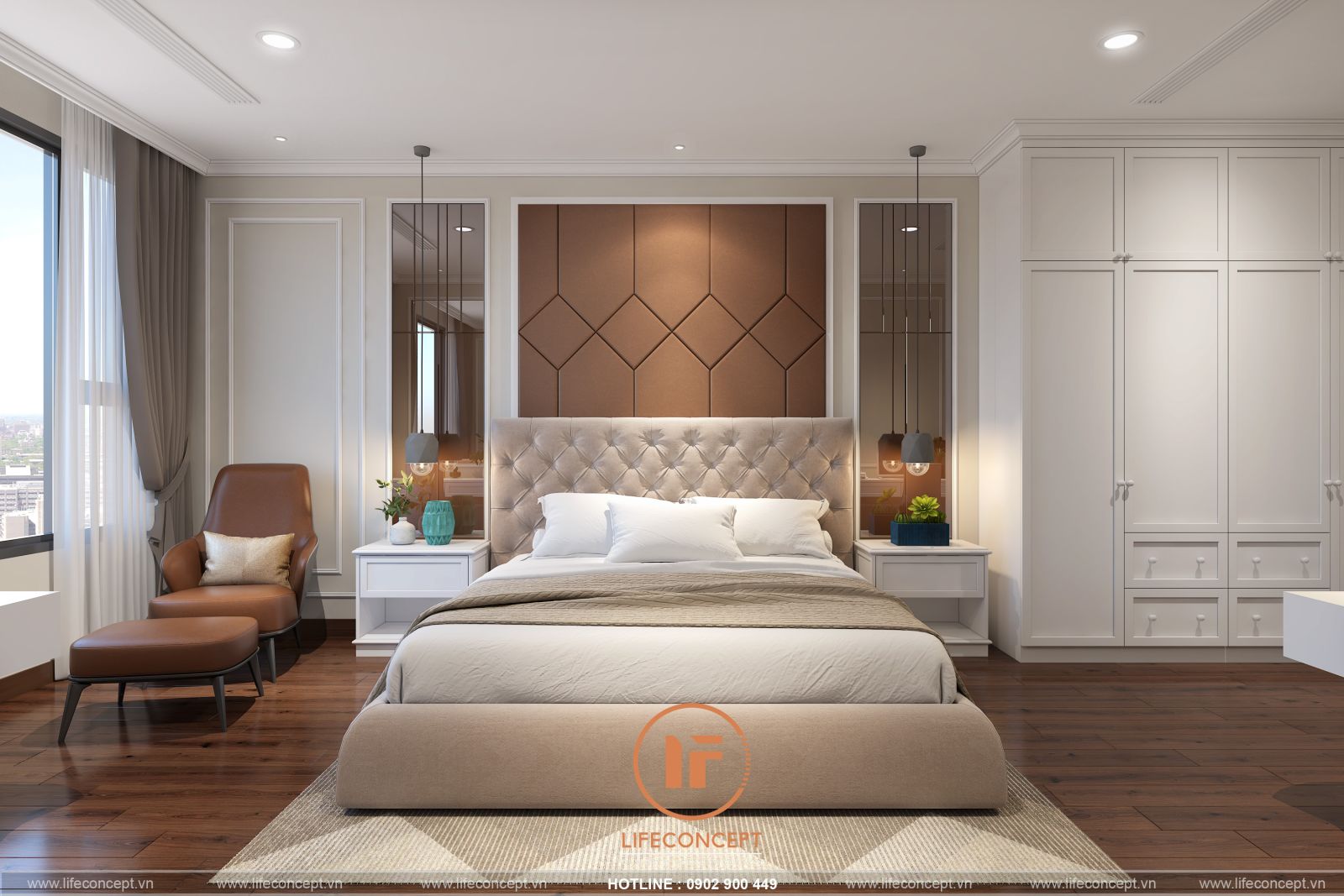 Phòng ngủ Master được thiết kế theo tiêu chuẩn resort với tông màu trầm ấm, tập trung vào sự thư giãn. Góc làm việc nhỏ gọn tận dụng ánh sáng bên cửa sổ giúp tăng hiệu suất công việc.