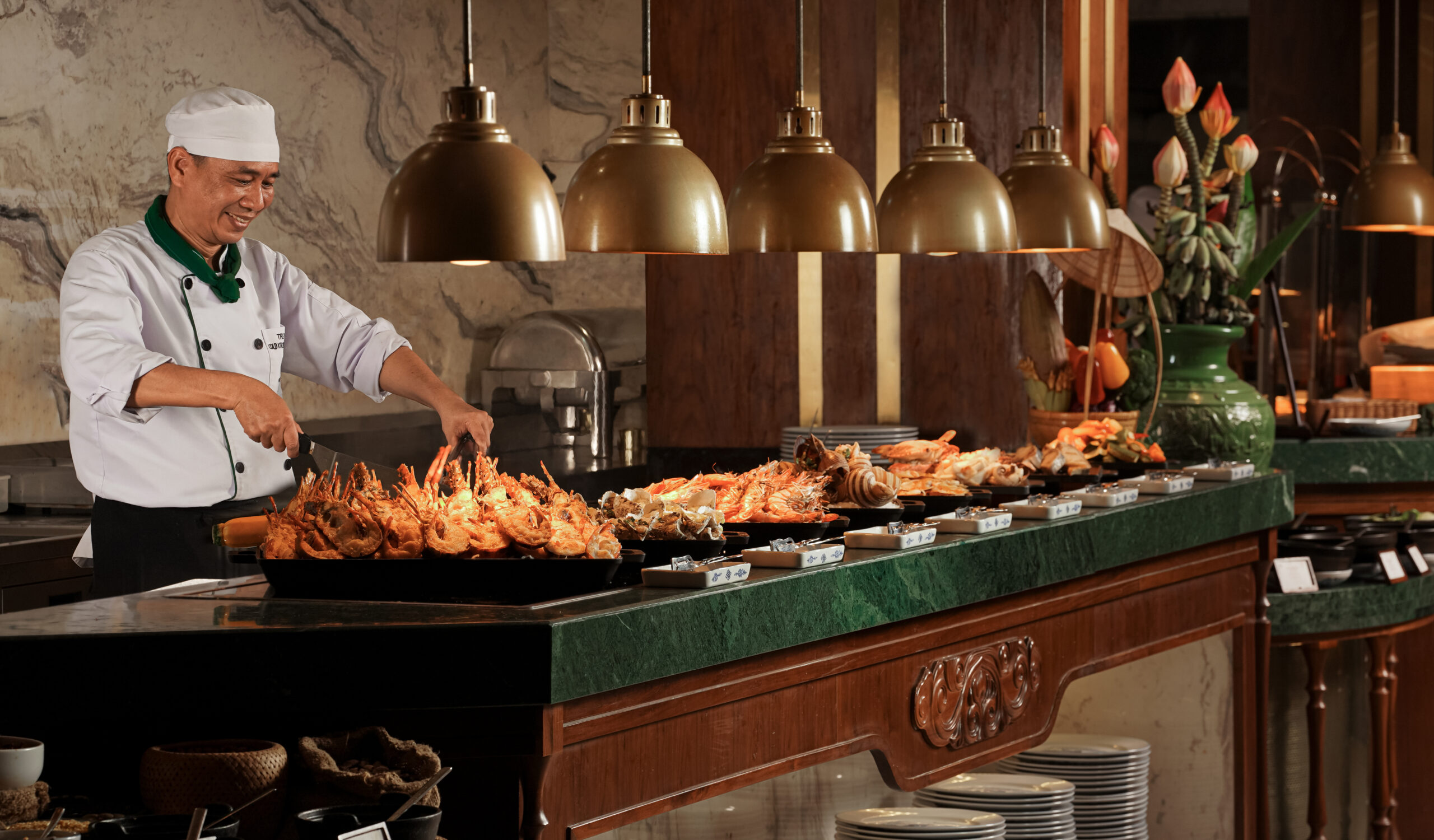 Tiệc buffet Noel tại NovaWorld được thiết kế như một lễ hội ẩm thực mở – nơi thực khách có thể vừa thưởng thức món ngon, vừa hòa mình vào không gian nghệ thuật.