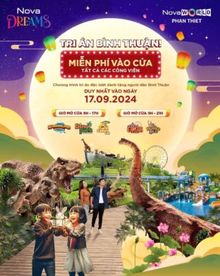 Nhân dịp Trung Thu 17/09/2024, NovaDreams tổ chức chương trình đặc biệt Tri Ân Bình Thuận, mang đến cơ hội vui chơi miễn phí cho toàn bộ người dân Bình Thuận tại các công viên nổi tiếng của NovaWorld Phan Thiết. Đây là sự kiện hấp dẫn với quy mô lớn, hứa hẹn mang đến những trải nghiệm vui tươi, sôi động cho người dân và du khách.